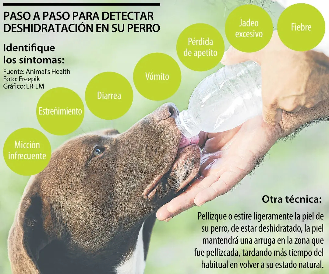 Si la piel se demora más de dos segundos en regresar a la normalidad, el perro está deshidratado.[6]